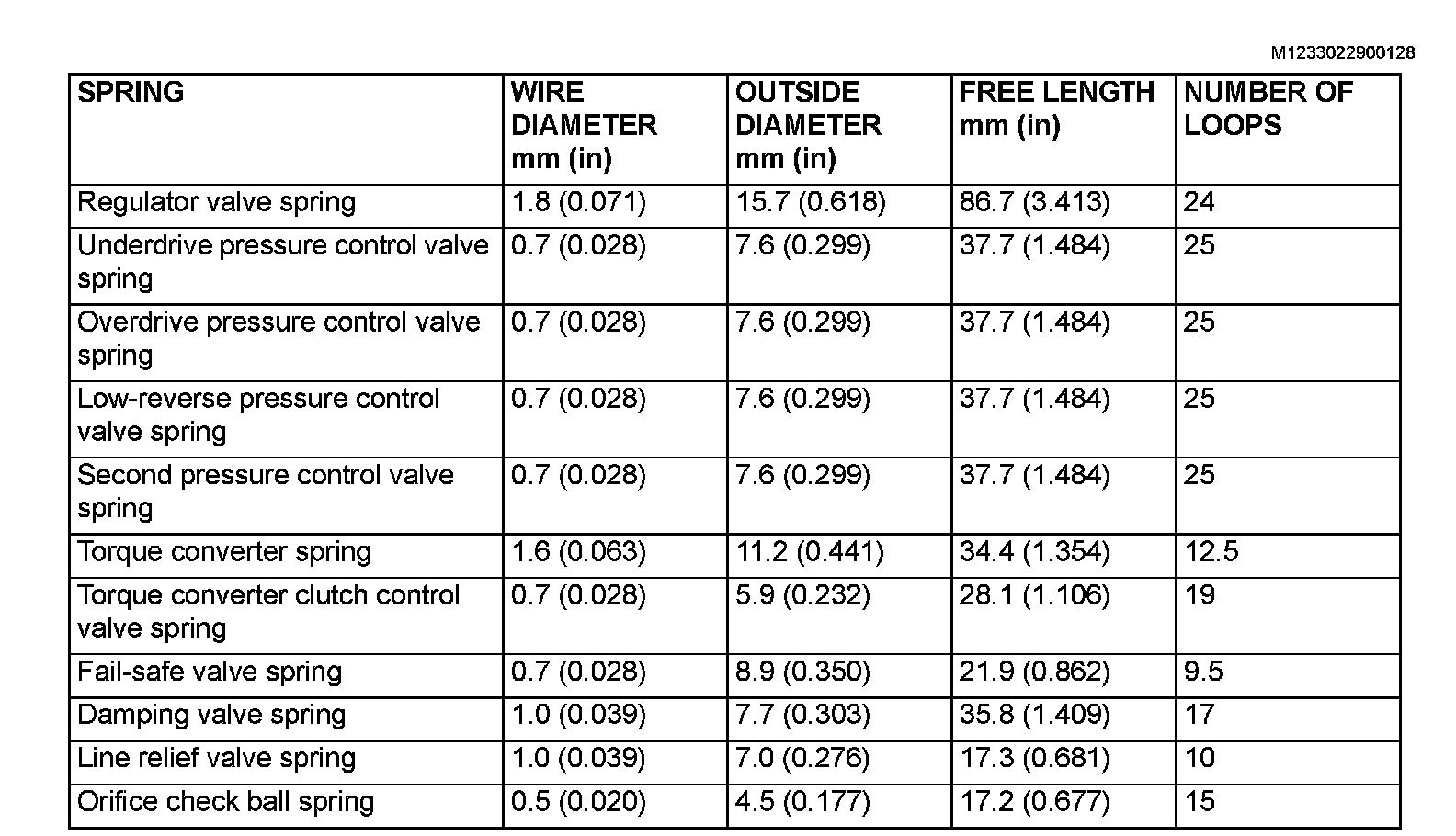 VALVE BODY SPRING IDENTIFICATION TABLE: