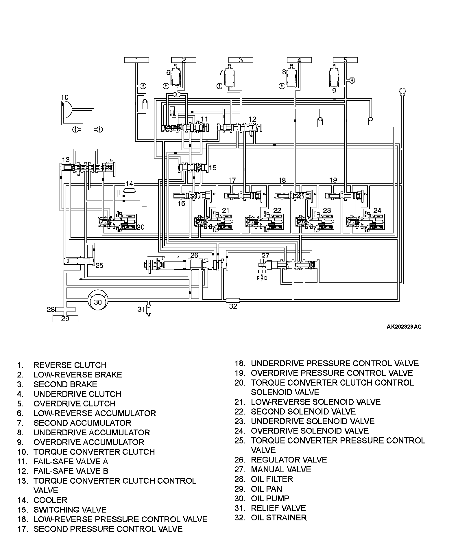 Parts related to oil pressure regulation are the oil pump, which pressurizes the oil; the regulator, which controls the pressure setting; the solenoid valves, which change the oil pressure with electrical signals; the pressure control valve, which controls the oil pressure coming from the solenoid valve that affects each clutch and brake; valves, which retain the oil pressure through the lines; and finally the valve body, which houses all the valves.