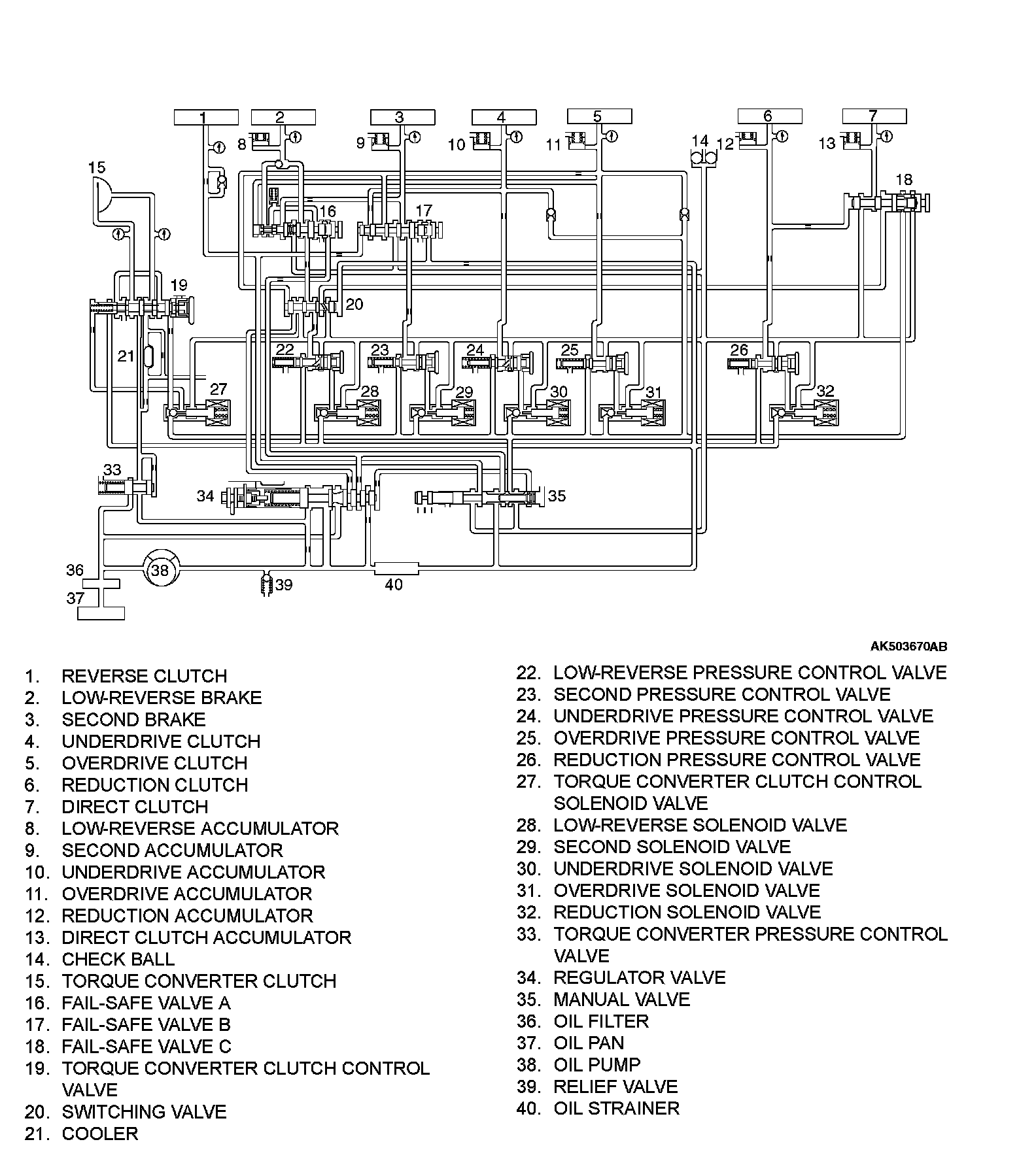 Parts related to oil pressure regulation are the oil pump, which pressurizes the oil; the regulator, which controls the pressure setting; the solenoid valves, which change the oil pressure with electrical signals; the pressure control valve, which controls the oil pressure coming from the solenoid valve that affects each clutch and brake; each kind OD valve, which carry out the retention of the oil pressure through the lines; and finally the valve body, which houses all the valves.