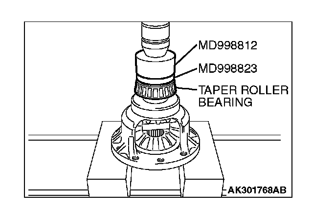 Using special tools MD998812 and MD998823, press in the taper roller bearing.