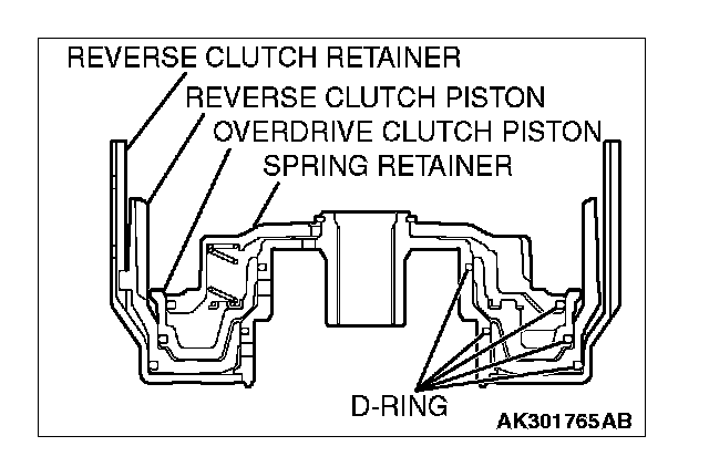1. Install D-rings in the grooves on the reverse clutch retainer, piston, overdrive clutch piston and spring retainer. Be careful not to twist or damage the D-rings.