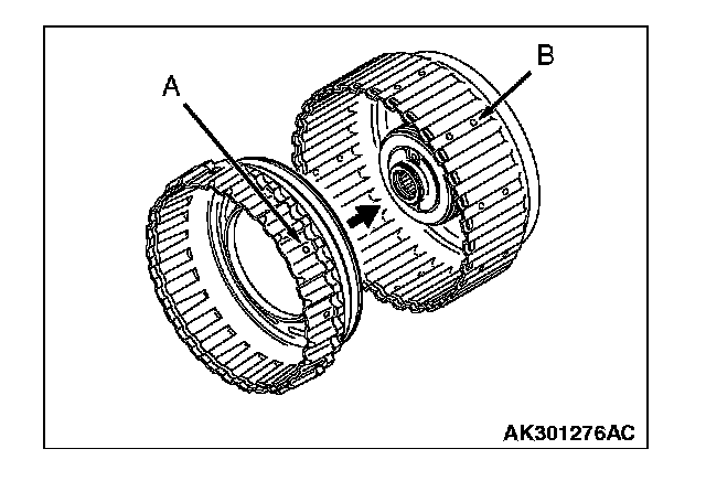 2. Assemble the clutch discs and clutch plates, one on top of the other, inside the reverse clutch piston. Assemble both clutch plates so that the places with no teeth (marked "A") are aligned with the holes in the retainer (marked "B").