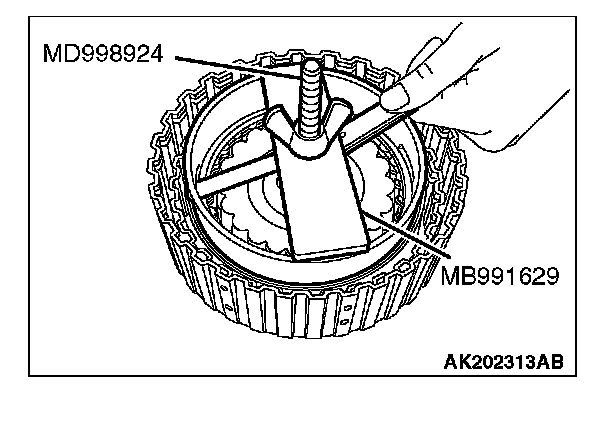 2. Set special tools MB991629 and MD998924 as shown in the illustration, and compress the clutch element.