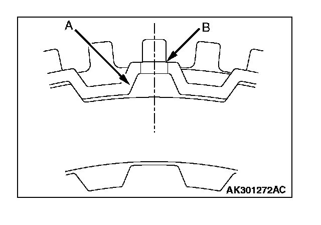 2. Install the clutch reaction plate in the direction shown. Install it the same as the clutch plates, so that the areas with no teeth (marked "A") are aligned with the retainer (marked "B").