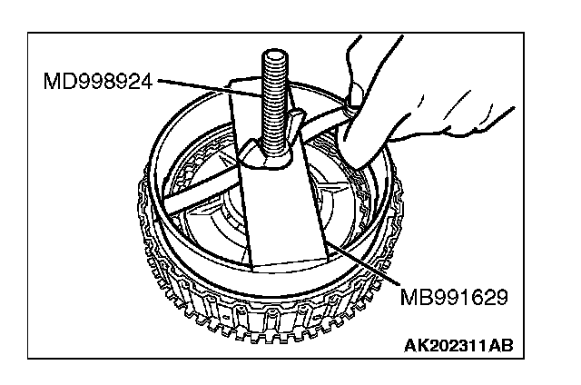 2. Set special tools MB991629 and MD998924 as shown in the illustration, and then compress the clutch element.