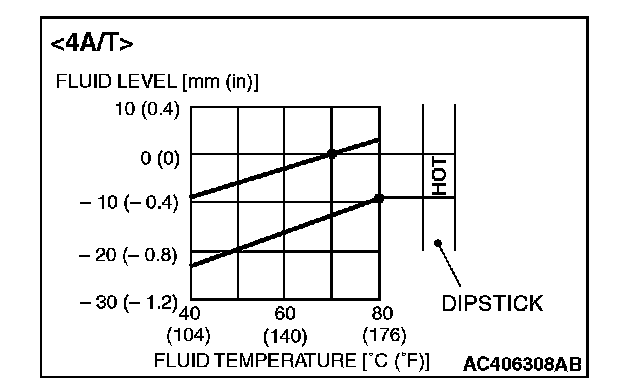 NOTE: If it takes some amount of time until the transmission fluid reaches its normal operating temperature [70 -80°C (158 -176°F)], check the transmission fluid level by referring to the left diagram.
