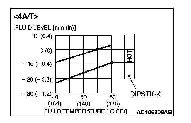 NOTE: If it takes some amount of time until the transmission fluid reaches its normal operating temperature [70-80°C (158-176°F)], check the transmission fluid level by referring to the left diagram.