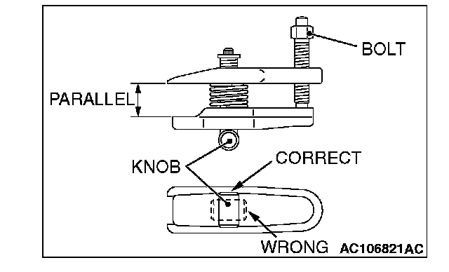 2. Turn the bolt and knob as necessary to make the jaws of special tool MB991897 parallel, tighten the bolt by hand and confirm that the jaws are still parallel.