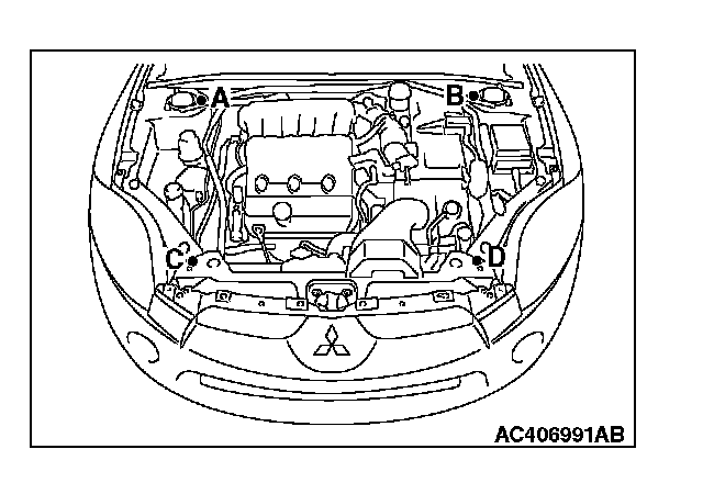 (1) Set special tool MB991895 to the front fender mounting bolts (A and B) and the radiator support upper insulator mounting bolts (C and D), which are located in the engine compartment, as shown.