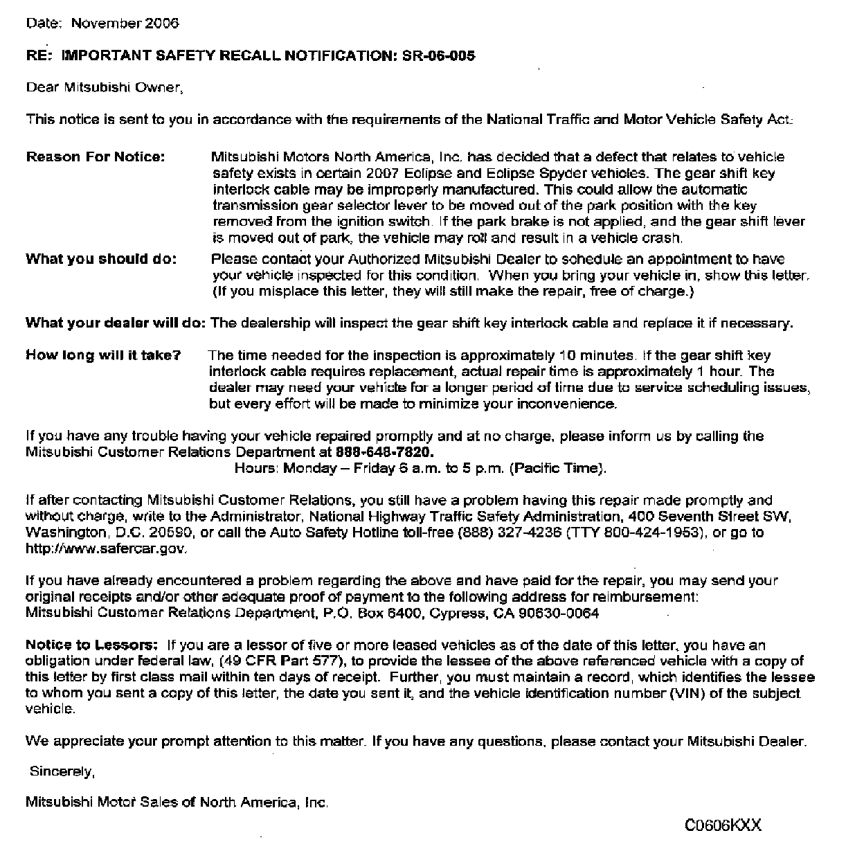 Recall - Shift Interlock Cable Inspection/Replacement