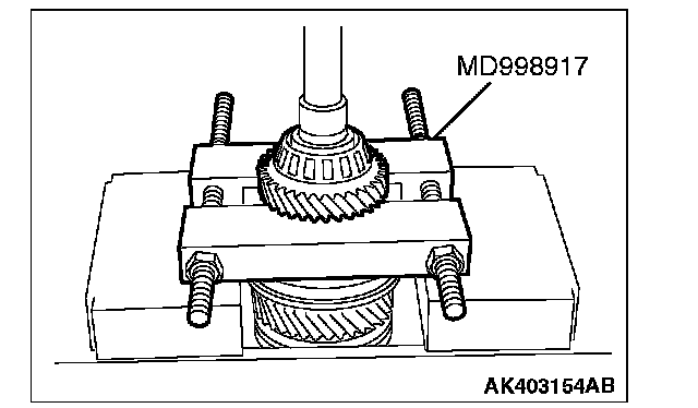6. Using special tool MD998917, support the 5th gear sub-assembly and remove the 5th-6th hub sleeve, synchronizer outer ring No.3 and 5th gear sub-assembly.