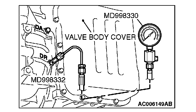 3. Connect the special tools (3.0 MPa (427 psi) oil pressure gauge [MD998330] and adapters [MD998332, MD998900, MB992018 [5A/T]]) to each pressure discharge port.