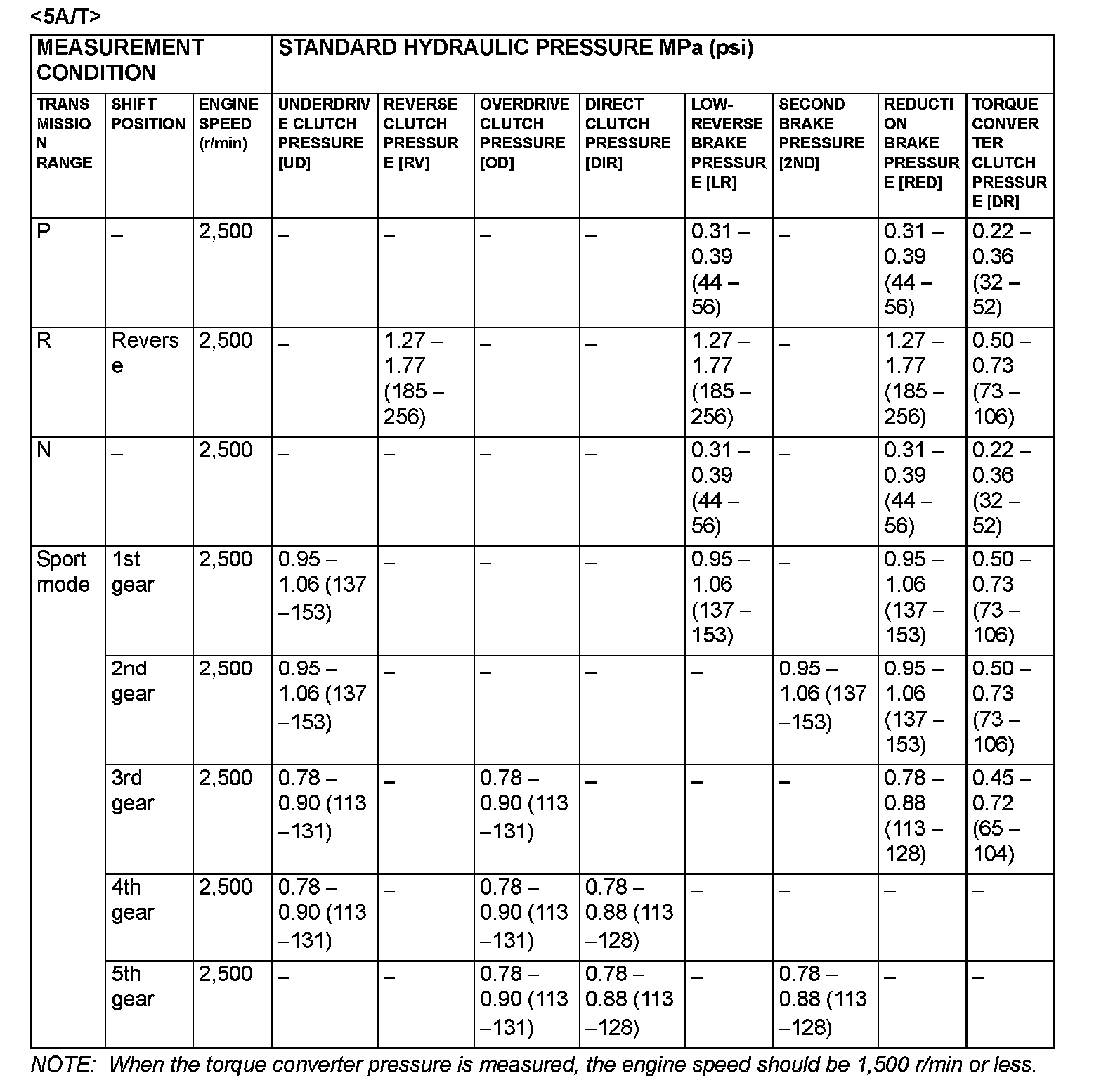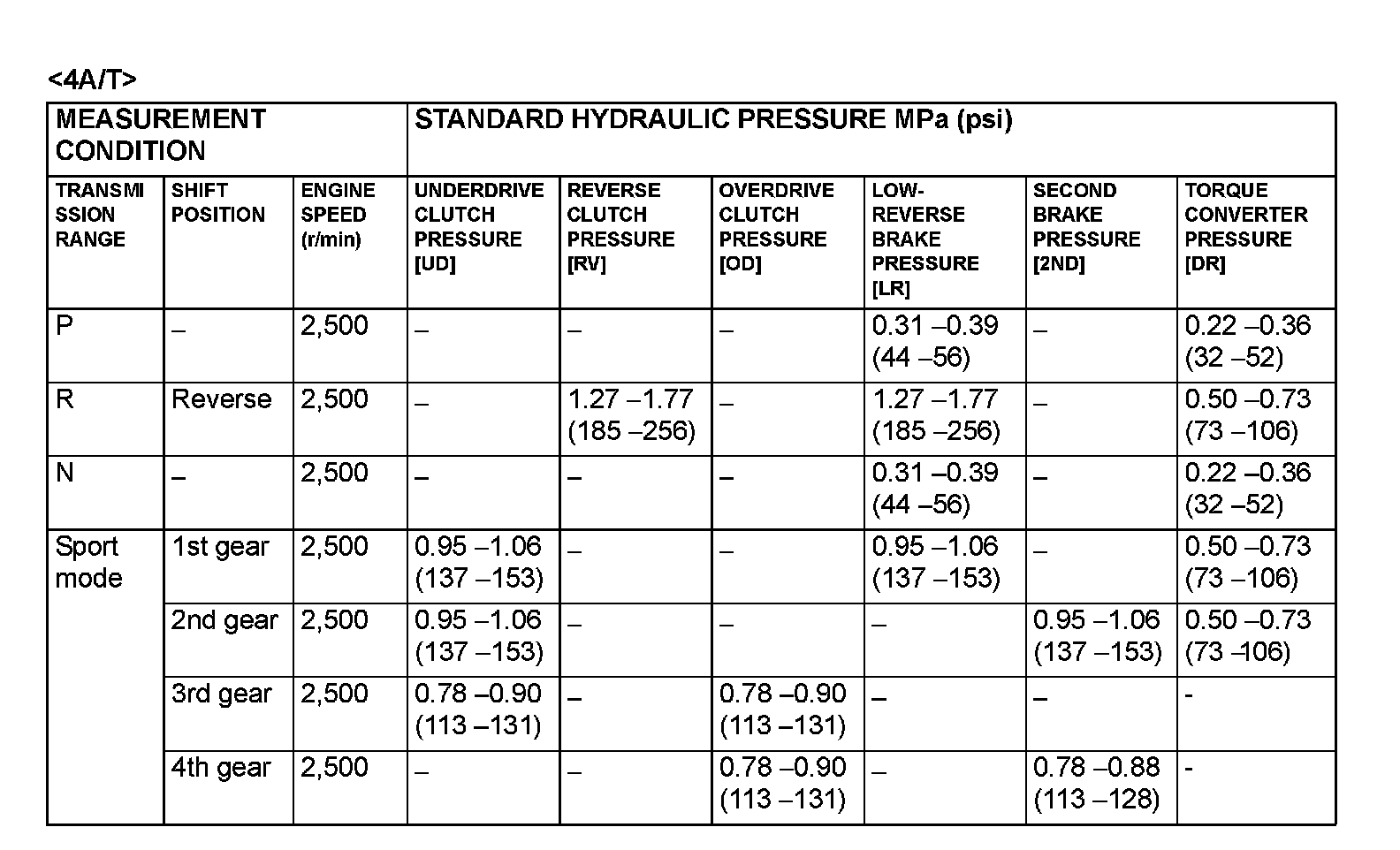 - Transmission fluid temperature: 70-80°C (158-176°F)