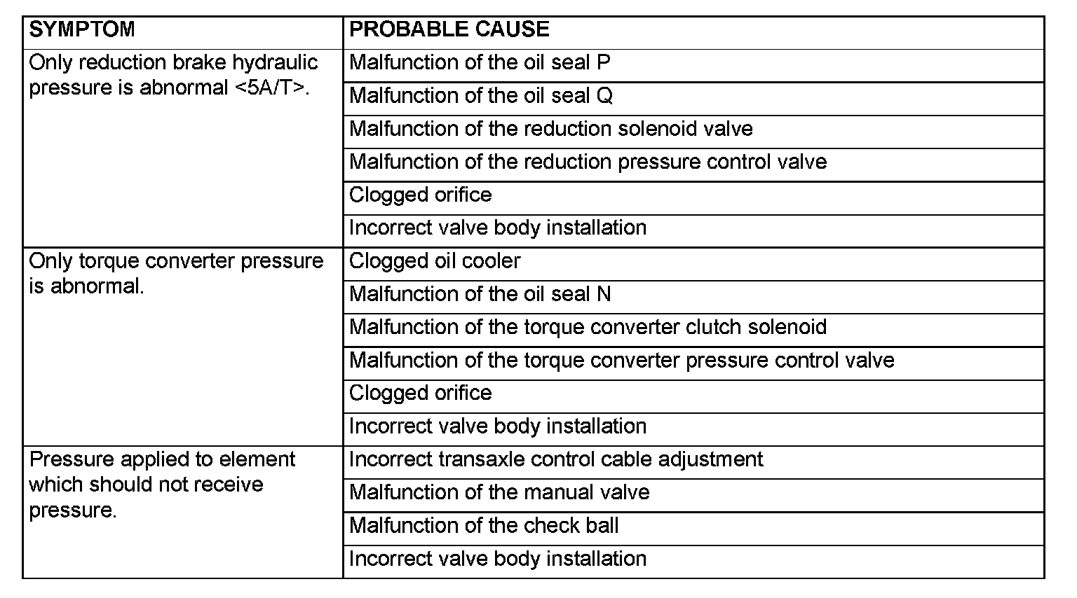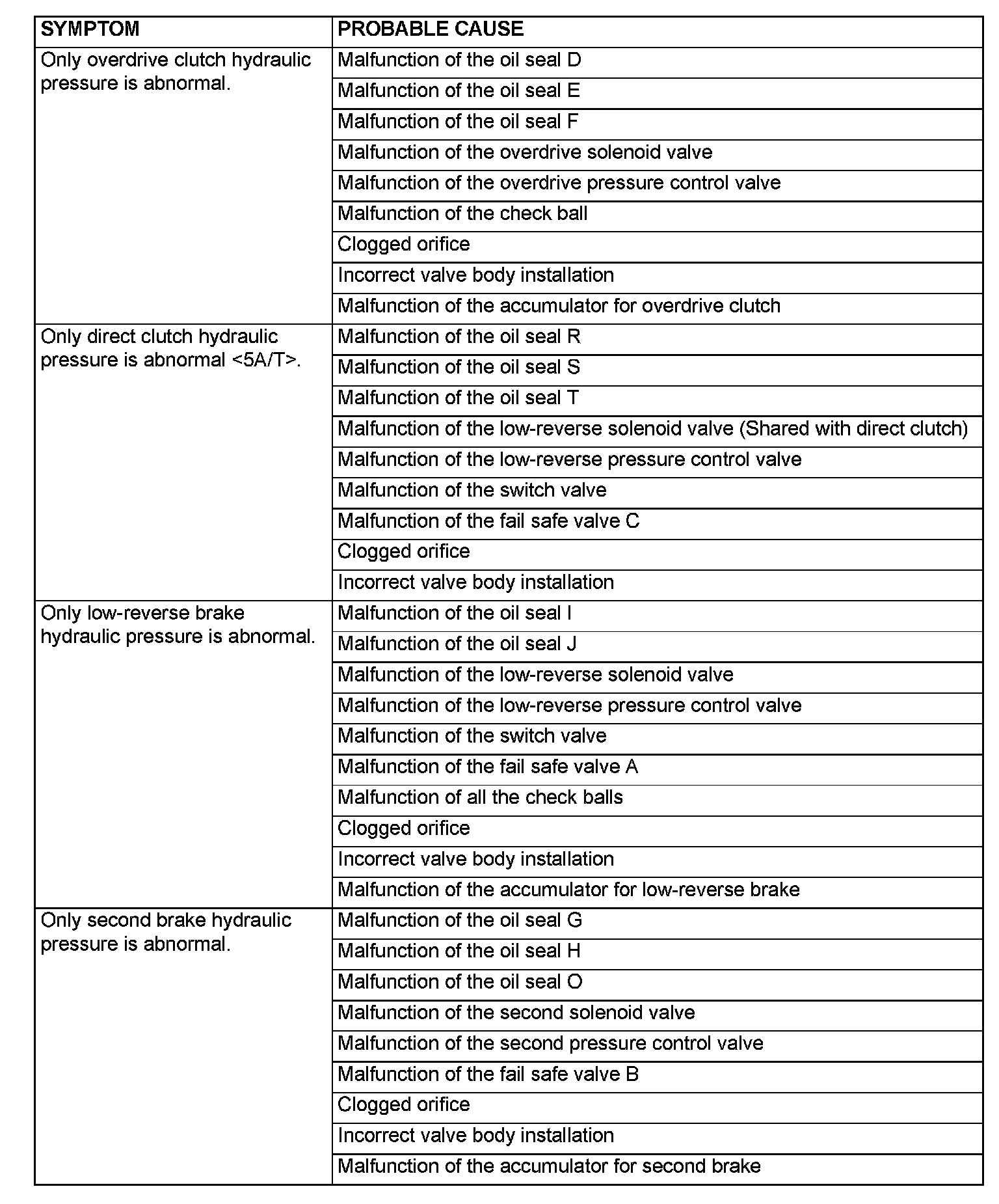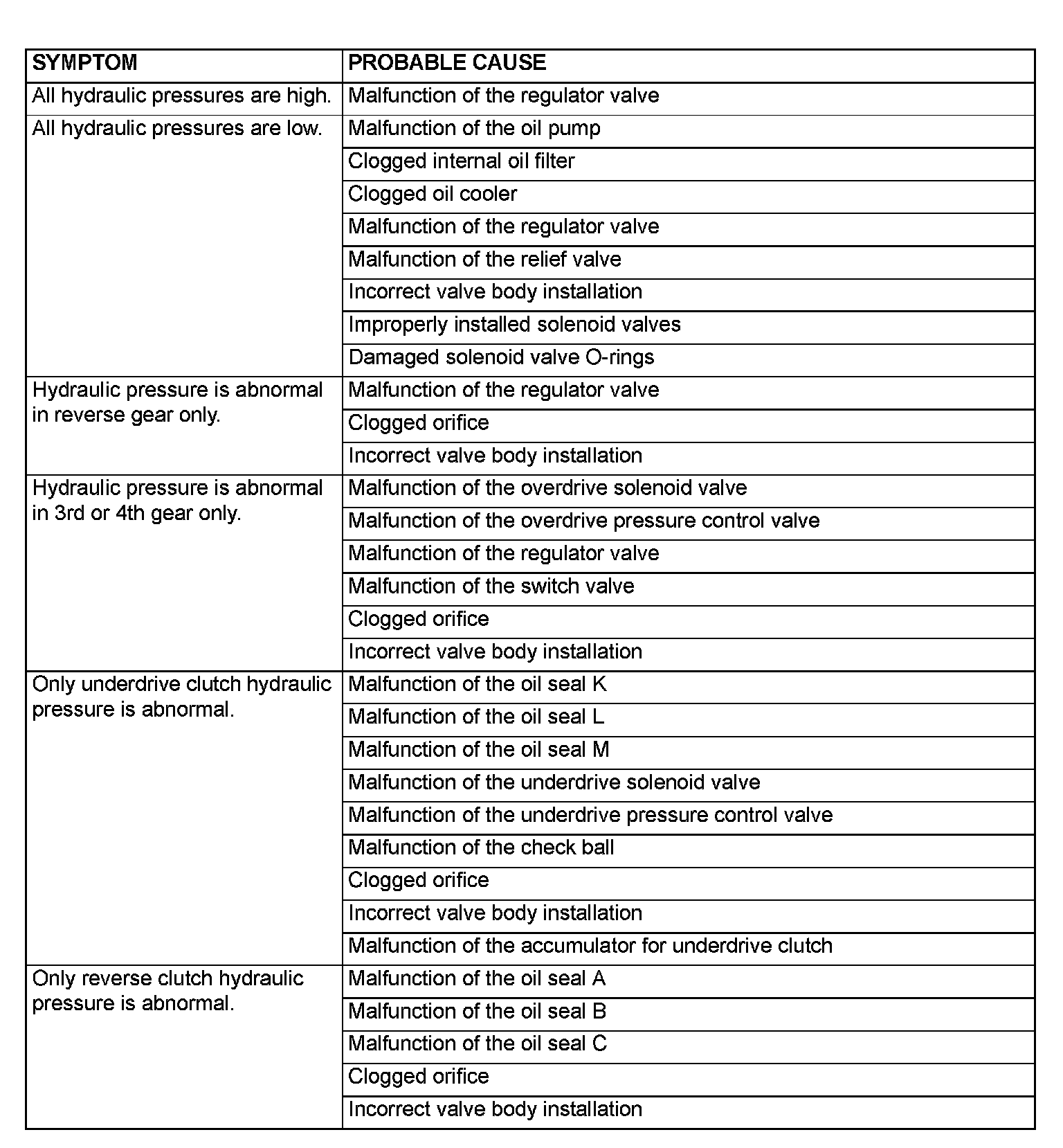 HYDRAULIC PRESSURE TEST DIAGNOSIS TABLE