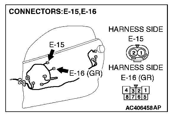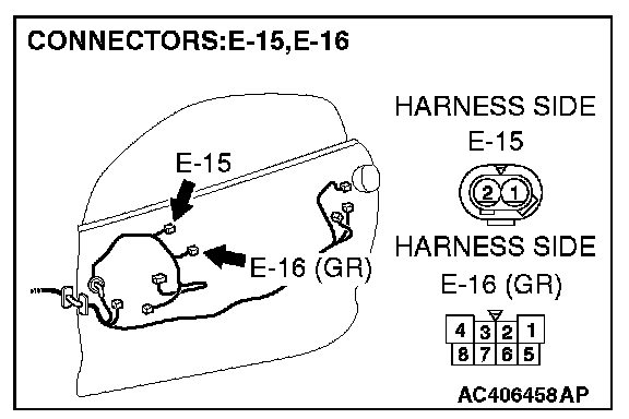STEP 8. Check the wiring harness between power window motor (LH) connector E-16 (terminal 2) and inside handle switch (LH) connector E-15 (terminal 2).
