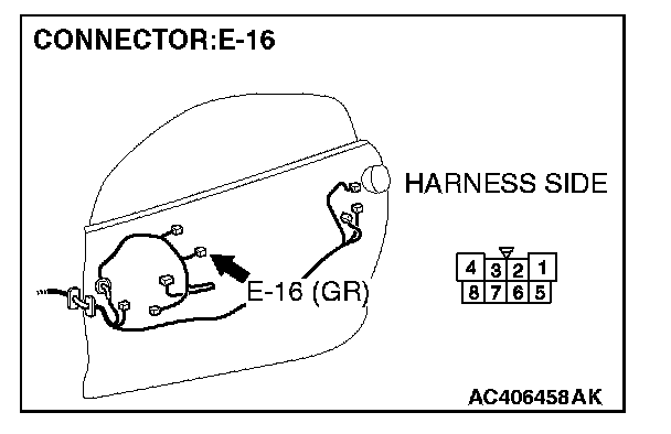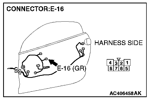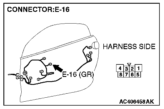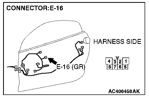 1. Disconnect power window motor (LH) connector E-16 and measure the voltage available at the wiring harness side of the connector.
