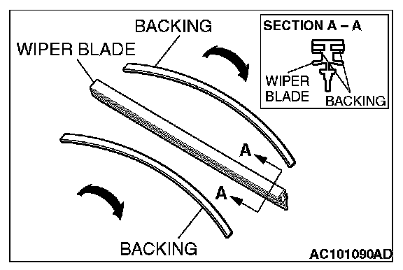 CAUTION: Ensure that the backings are bent in the direction indicated, and then install the backings to the wiper blade rubber.