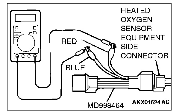 1. Disconnect the heated oxygen sensor connector and connect special tool MD998464 to the connector on the heated oxygen sensor side.