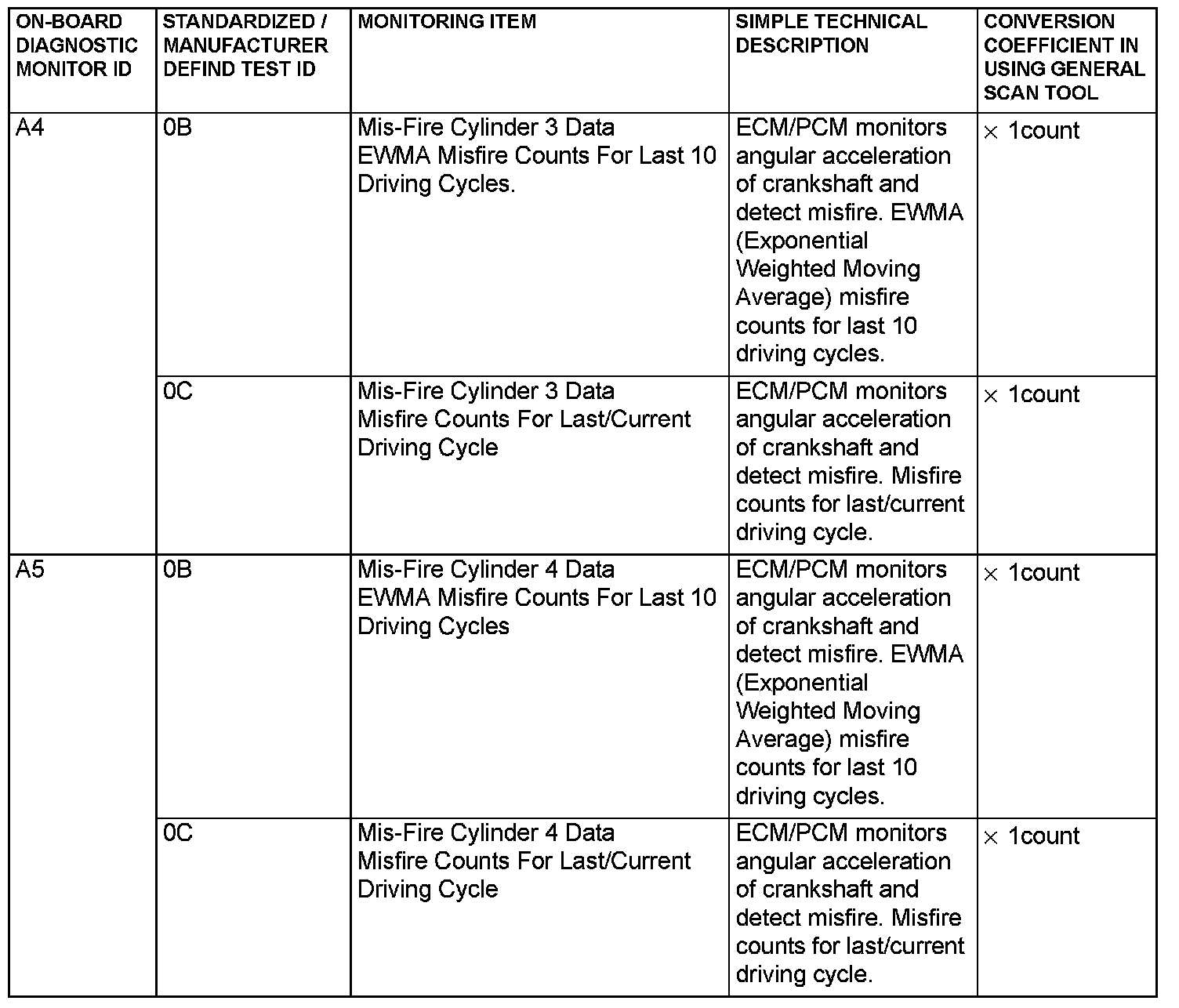 - When the monitored test results are erased by the battery disconnection and so on, the ECM/PCM outputs the values in hexadecimal of "0000" or "FFFF", otherwise it outputs abnormal values and so on. In case of this, the ECM/PCM outputs are handled as invalid- values. When the first monitor (Readiness Status) is completed after this, the ECM/PCM outputs the valid-values.