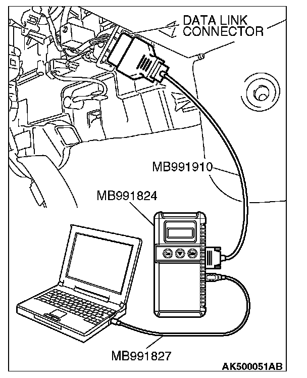 NOTE: Disconnecting the scan tool MB991958 is the reverse of the connecting sequence, making sure that the ignition switch is at the "LOCK" (OFF) position.