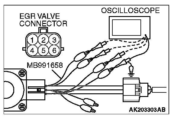 2. Connect the oscilloscope probe to the EGR valve connector terminal No. 1, terminal No. 3, terminal No. 4, terminal No. 6 respectively.