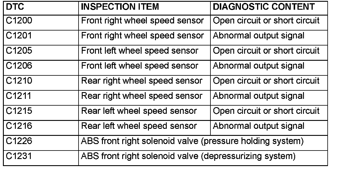 DIAGNOSTIC TROUBLE CODE CHARTCAUTION: During diagnosis, a DTC code associated with another system may be set when the ignition switch is turned on with connector(s) disconnected. On completion, confirm all systems for DTCs. If DTC code(s) are set, erase them all.