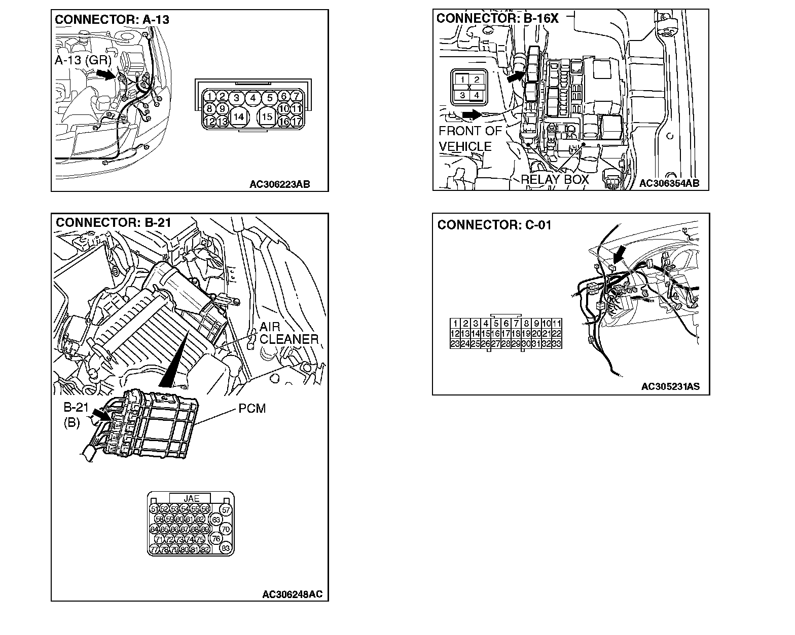 STEP 12. Check harness for open circuit or short circuit to ground between A/T control relay connector B-16X (terminal 4) in the engine component relay box and PCM connector B-21 (terminals 57 and 70).