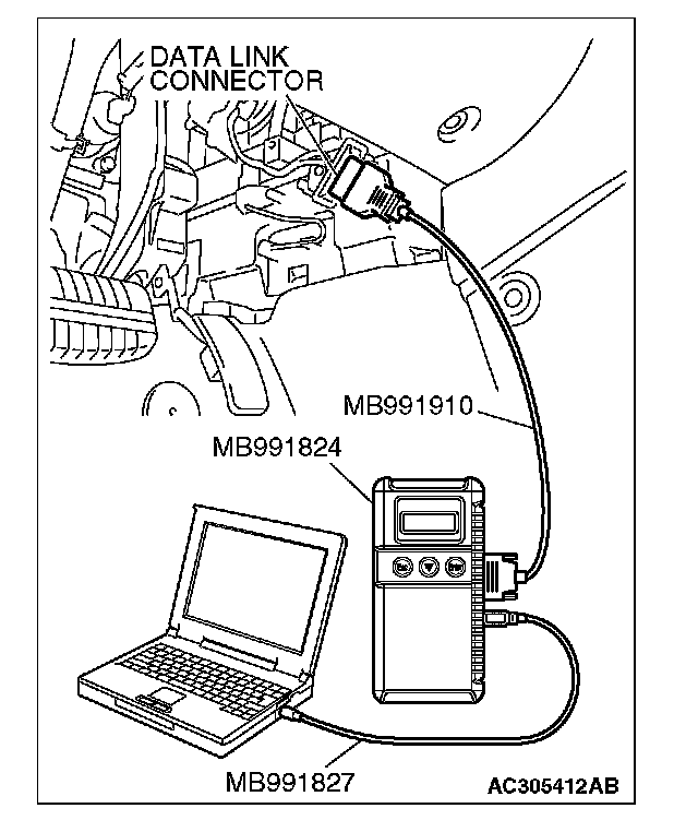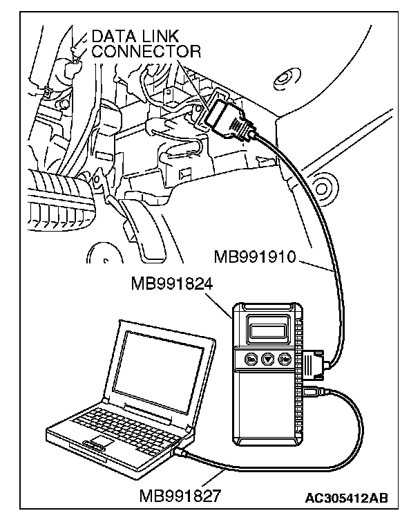 CAUTION: To prevent damage to scan tool MB991958, always turn the ignition switch to the "LOCK" (OFF) position before connecting or disconnecting scan tool MB991958.