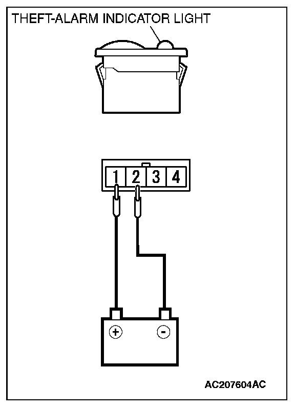 Connect the positive battery terminal to theft-alarm indicator light terminal No.1, and connect the negative battery terminal to theft-alarm indicator light terminal No.2. Then, confirm that the theft-alarm indicator light illuminates.