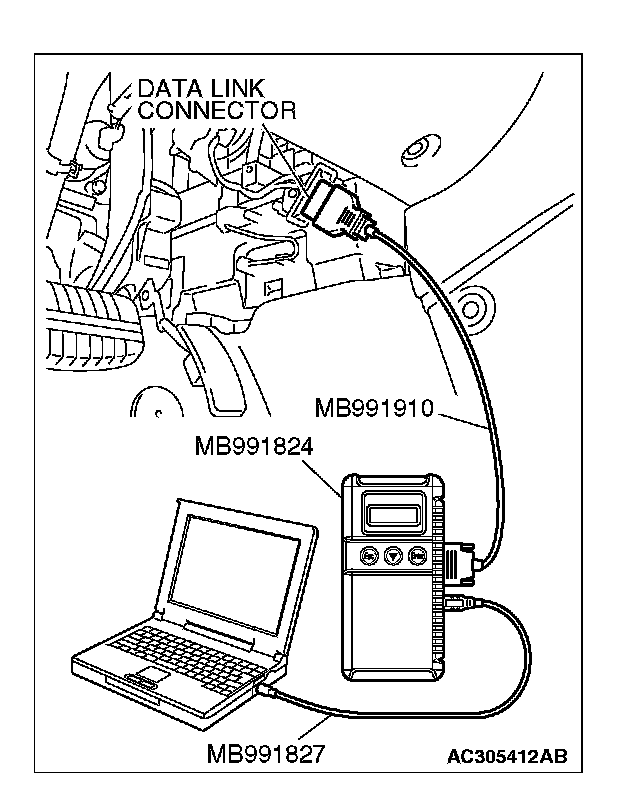 CAUTION: To prevent damage to scan tool MB991958, always turn the ignition switch to the "LOCK" (OFF) position before connecting or disconnecting scan tool MB991958.