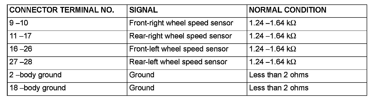 1. Turn the ignition switch to the "LOCK" (OFF) position and disconnect the ABS-ECU connectors before checking resistance and continuity.