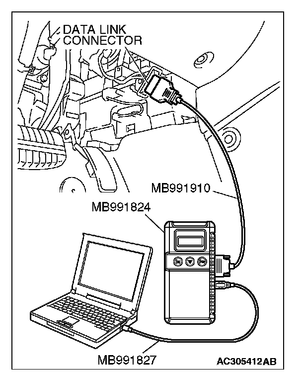 CAUTION: To prevent damage to scan tool MB991958, always turn the ignition switch to the "LOCK" (OFF) position before connecting or disconnecting scan tool MB991958.