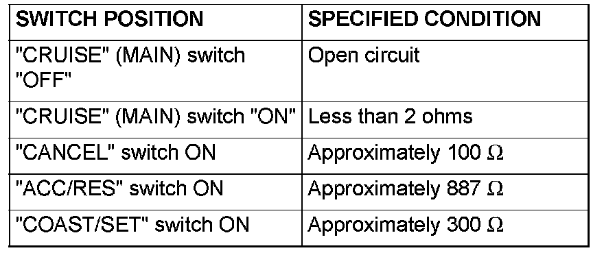 2. Measure the resistance between terminal 2 and terminal 3 when each of the "COAST/SET", "ACC/RES", "CANCEL" and "CRUISE" (MAIN) switches is pressed. If measure values measured at the time correspond to those in the table below, the resistance values are correct.