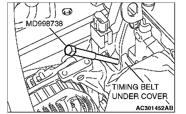 2. Remove the timing belt under cover rubber plug and then set special tool MD998738.