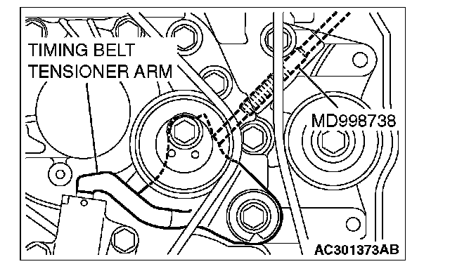 3. Screw in special tool MD998738 until it contacts the timing belt tensioner arm.