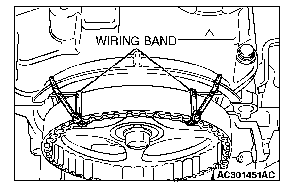 4. Secure the camshaft sprocket and valve timing belt with wiring bands and so on to prevent slippage between the camshaft sprocket and valve timing belt.