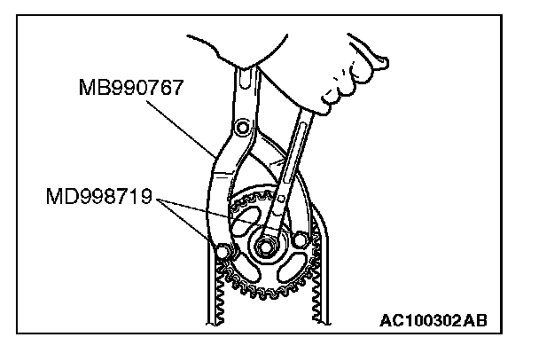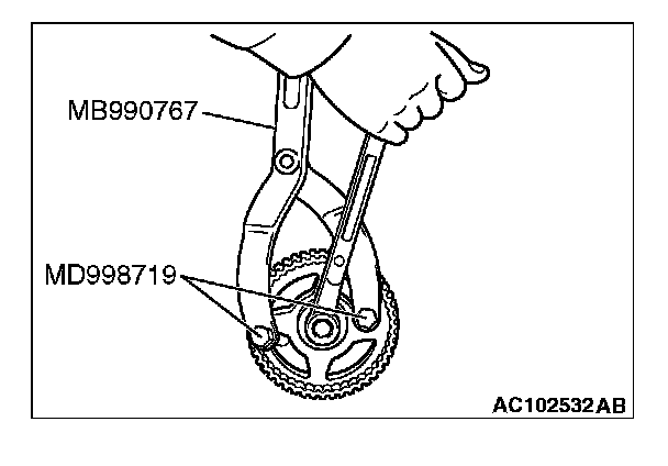 1. Hold the camshaft sprocket with special tools MB990767 and MD998719 in the same manner as removal.