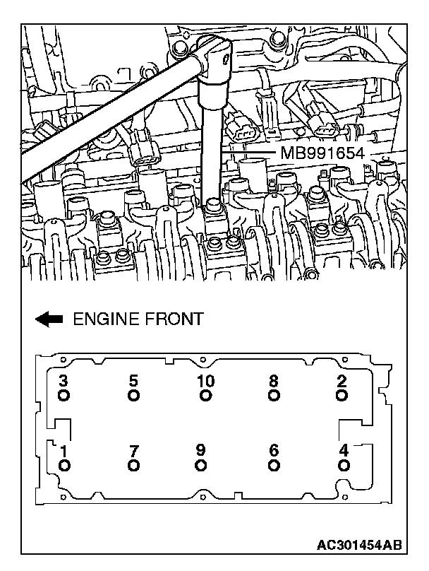 3. Use special tool MB991654 to tighten the cylinder head bolts in the following procedures.