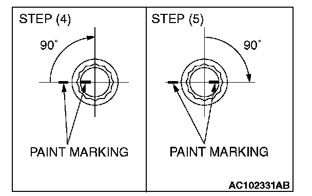 (5) Tighten in a 90 degree angle as shown in the instructions of the figure, then check to see that the paint mark on the head of the cylinder head bolts and the paint mark on the cylinder head is on a linear line.
