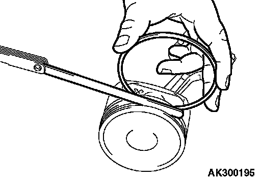 3. Insert the piston ring into the cylinder bore. Force the ring down with a piston, the piston crown being in contact with the ring, to correctly position it at right angles to the cylinder wall. Then, measure the end gap with a feeler gauge. If the ring gap is excessive, replace the piston ring.