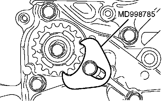 1. Set special tool MD998785 as shown to prevent the counterbalance shaft sprocket from turning together.