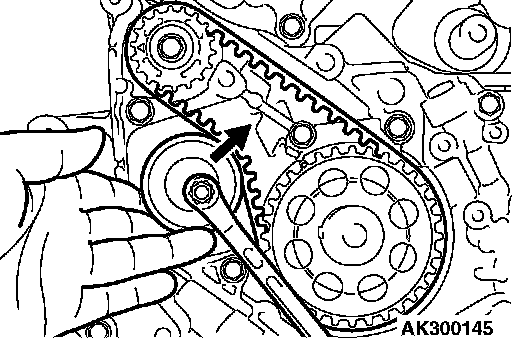 4. Move tensioner "B" in the direction of the arrow while lifting with your finger to give sufficient tension to the tension side of timing belt. In this condition, tighten the bolt to secure tensioner "B." When the bolt is tightened, use care to prevent the tensioner pulley shaft from turning with the bolt. If the shaft is turned with the bolt, the belt will be over tensioned.