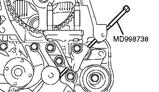 5. Set special tool MD998738 as shown and screw it in up to the position where the wire inserted in the auto-tensioner can be moved lightly.