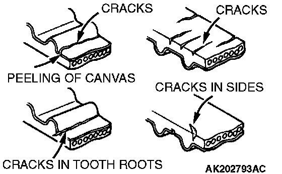 6. Abnormal wear of belt sides. Normal wear is indicated if the sides are sharp as if cut by a knife. Abnormal wear is indicated if the sides are ragged.