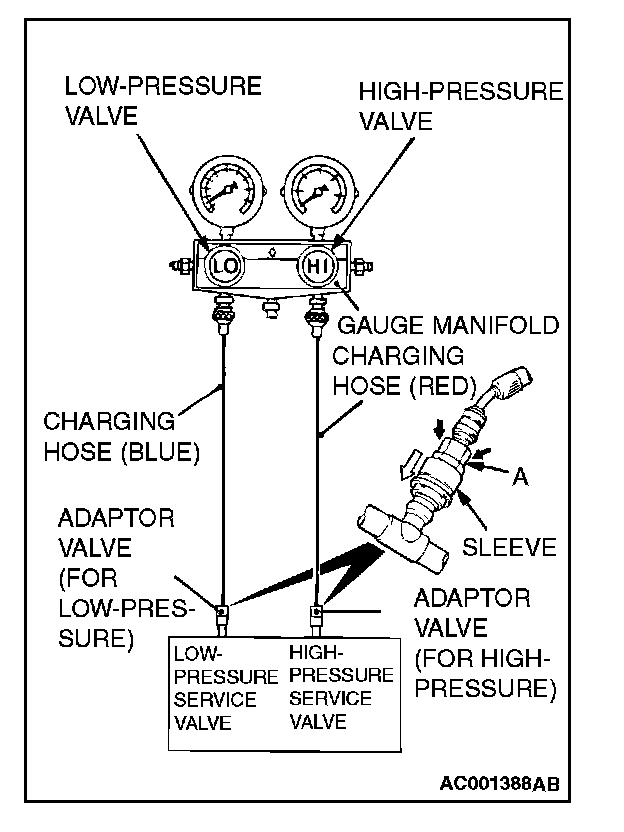 NOTE: The high-pressure service valve is on the A/C pipe and the low-pressure service valve is on the suction hose.