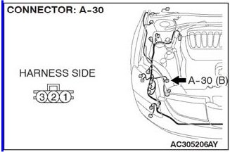 STEP 3. Check A/C pressure sensor connector A-30 for loose, corroded or damaged terminals or terminals pushed back in the connector.