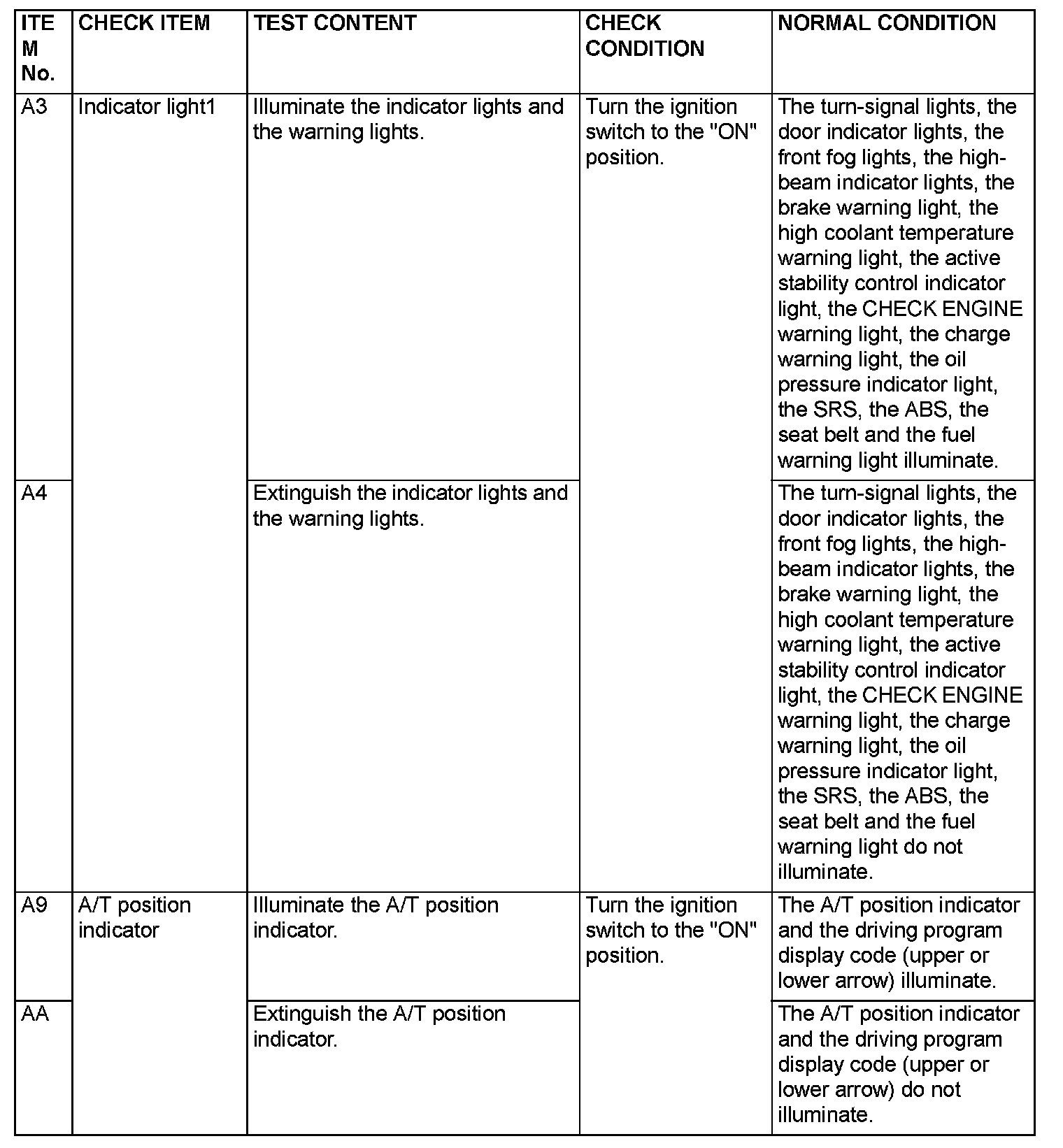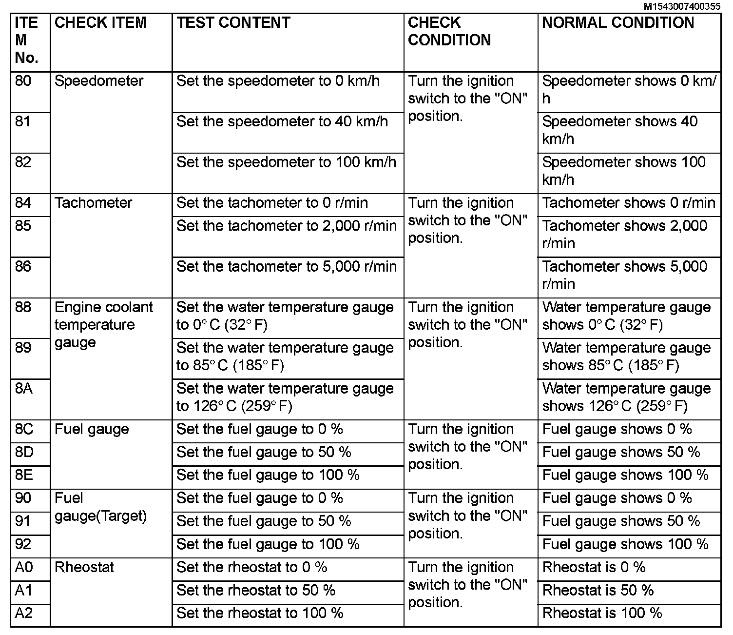 Actuator Test Reference Table