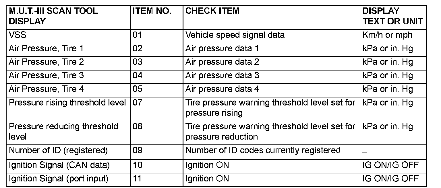 The following items can be read by the scan tool from the TPMS receiver input data.