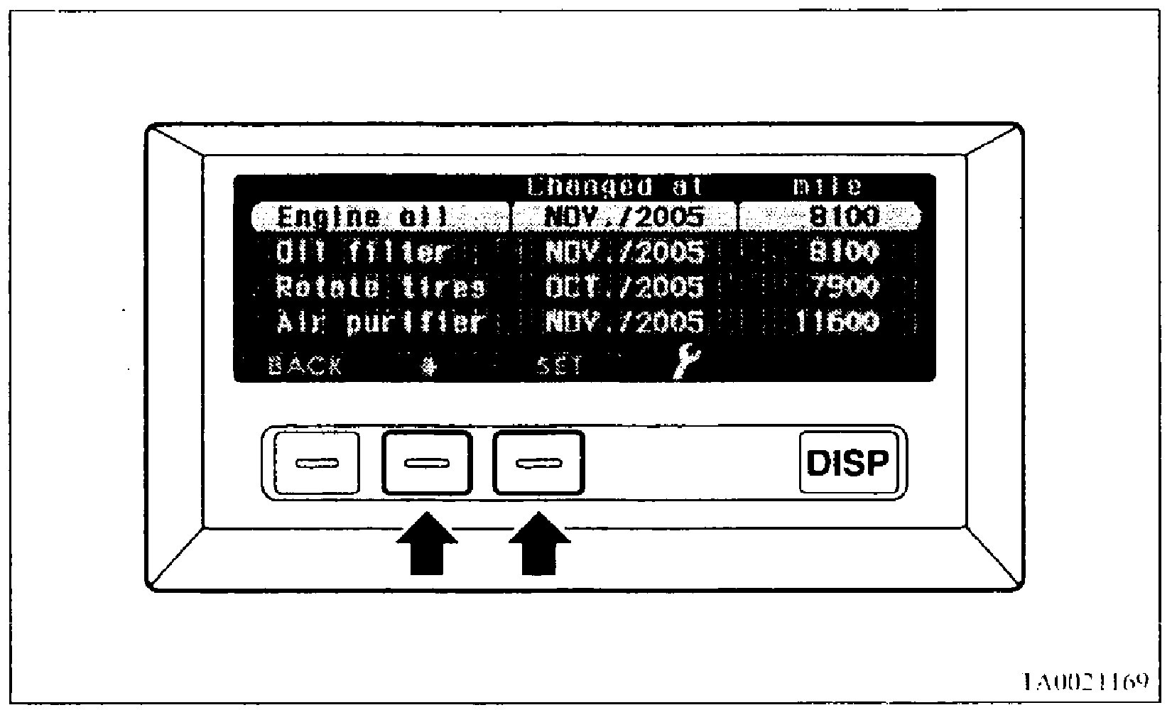 3. The date when maintenance was performed on the selected item will automatically be updated, and the driving distance until the next scheduled maintenance will flash. Press the "+" or "-" button to change the distance until the next scheduled maintenance. After adjusting the distance until the next scheduled maintenance, press the "SET" function button.