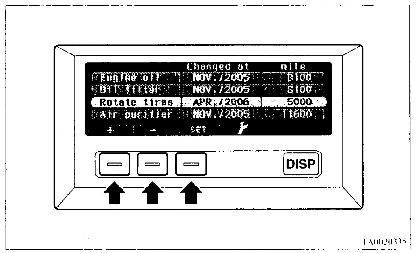 4. Press the "YES" function button to confirm the maintenance date and distance until next scheduled maintenance that were set in step 3. If you press the "NO" function button, the monitor will return to the display in step 2 of this procedure.